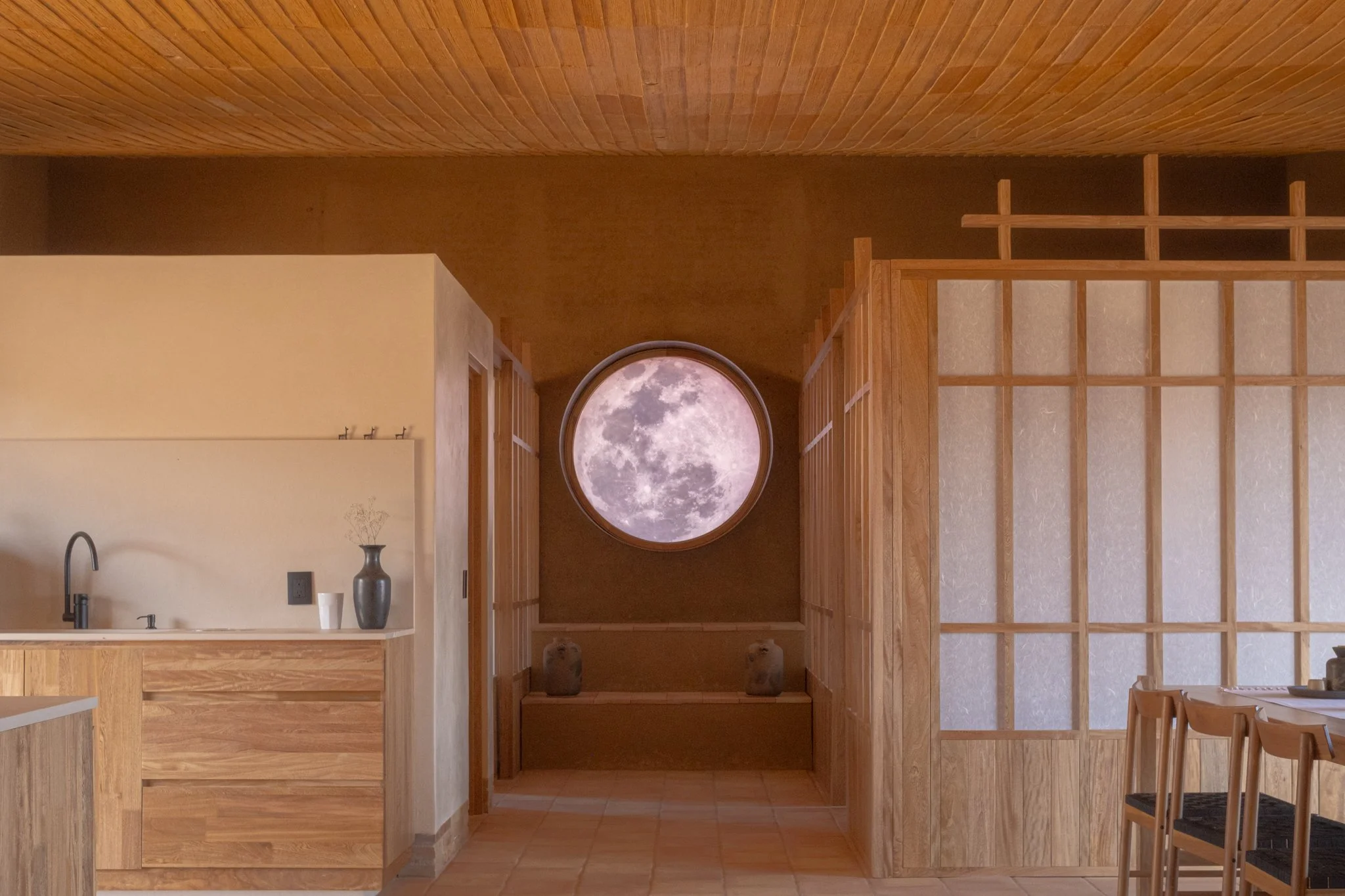 El resultado fue una casa receptora de energía, el techo como caldero recibe agua de la lluvia y la energía del cielo. La nave está alineada a la salida de la Luna, convirtiendo una ventana en un altar vivo y que da nombre a este hogar.